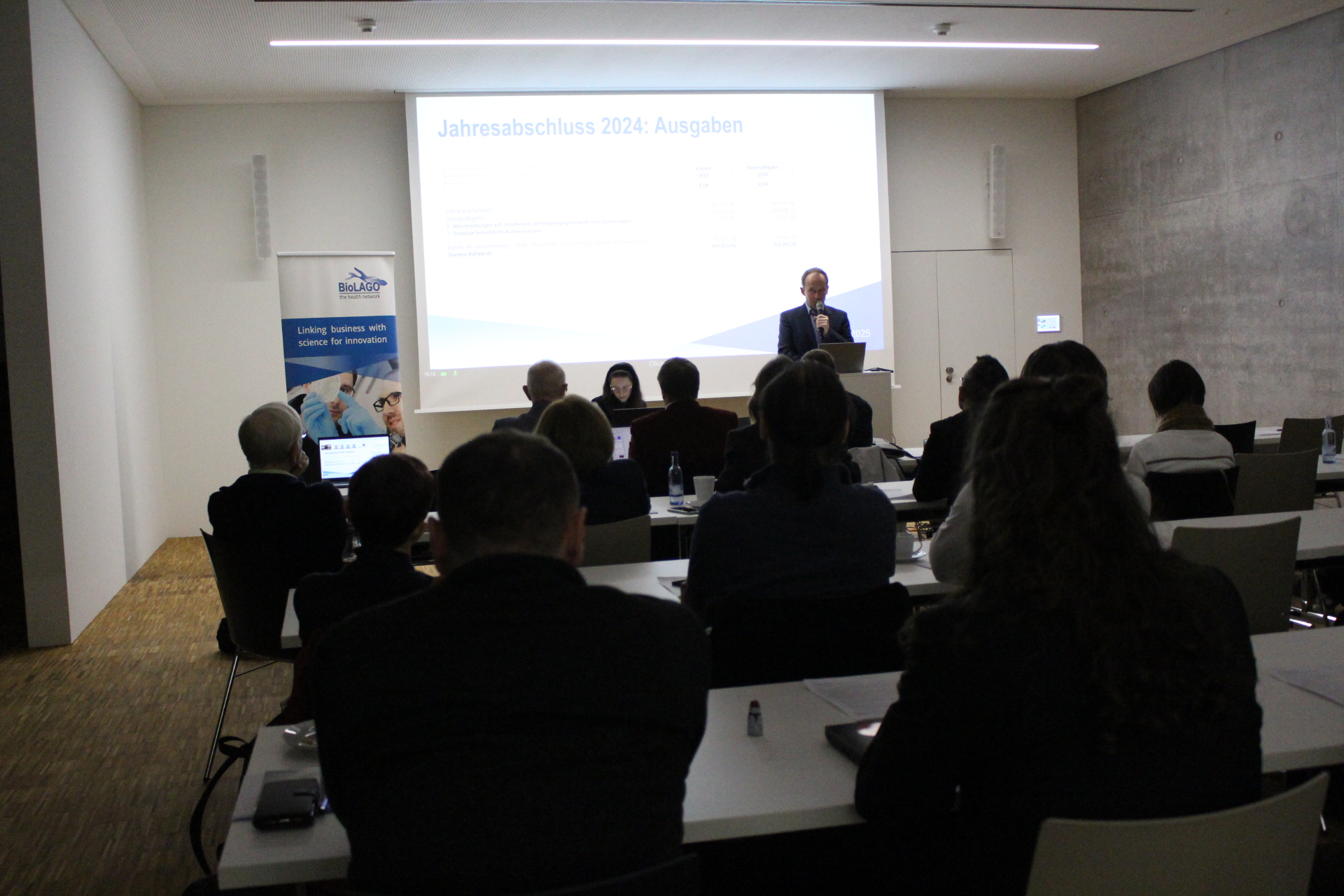Im Rahmen der Mitgliederversammlung stellten BioLAGO-Geschäftsführer Andreas Baur und Projektleiterin Eva Botzenhart-Eggstein aktuelle Aktivitäten, Projekte, Events sowie den Haushalt des Netzwerks vor. Die anstehenden Wahlen wurden wie gewohnt engagiert durch Marcus Karrer moderiert und durchgeführt. Rechnungsprüfer Rolf Würthle, Geschäftsführer der Bioplant Naturverfahren GmbH, stellte seine Ergebnisse vor: Es gab keinerlei Beanstandungen und die Entlastung des Vorstands wurde empfohlen. Für das Jahr 2026 wurde Rolf Würthle erneut einstimmig zum Rechnungsprüfer gewählt. Ein zentraler Programmpunkt war die Neuwahl des Vorstands für das kommende Jahr. Ab 2026 neu im Vorstand vertreten sind Dr. Samra Hamzic (Hochschule für Logopädie, St. Gallen) sowie Jan Kirchhoff, Geschäftsführer der medicalvalues GmbH aus Karlsruhe. Mit großem Dank verabschiedete sich Prof. Elmlinger von den Vorständen, die nicht erneut zur Wahl antraten: Dr. Simone Brunner, Dr. Bettina Müller sowie Ehrenvorsitzender und BioLAGO-Vordenker Prof. Dr. Klaus P. Schäfer.